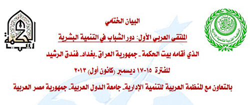 برعاية دولة رئيس وزراء جمهورية العراق الاستاذ نوري كامل المالكي افتتح الملتقى العربي الاول للشباب حول (دور الشباب في التنميةالبشرية) للمدة من 15-17/12 /2013 وعلى القاعة الكبرى لفندق الرشيد في بغداد.