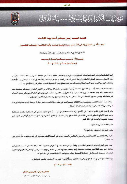 والعراق الدولة ... هو الإنسان والأرض والنظام والحكومة فمن اجل تسليط الضوء على الأسس الفكرية والعناصر الرئيسية في بناء الدولة من اجل ان نخرج بتصور علمي متكامل لنموذج دولة كان هذا المؤتمر.