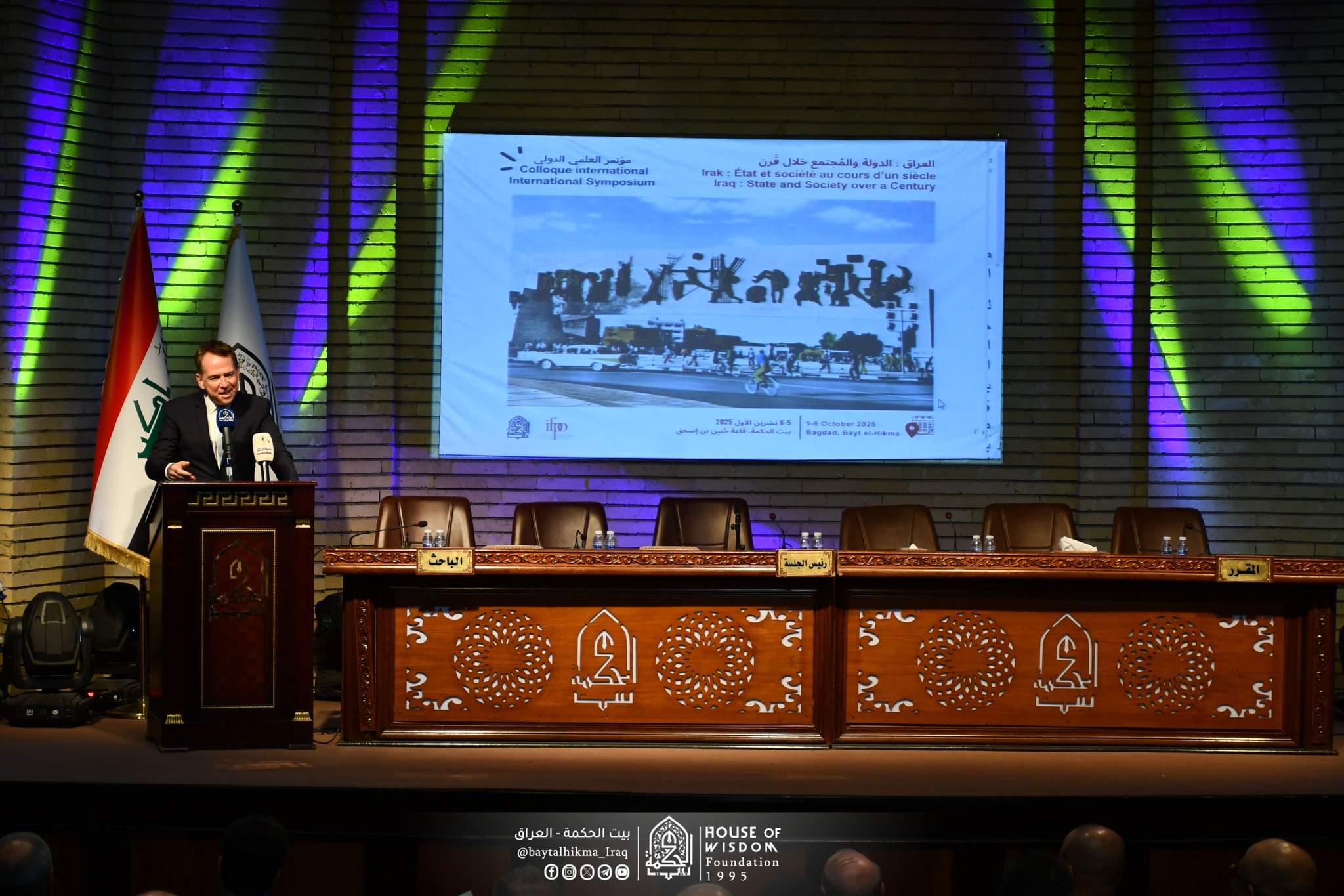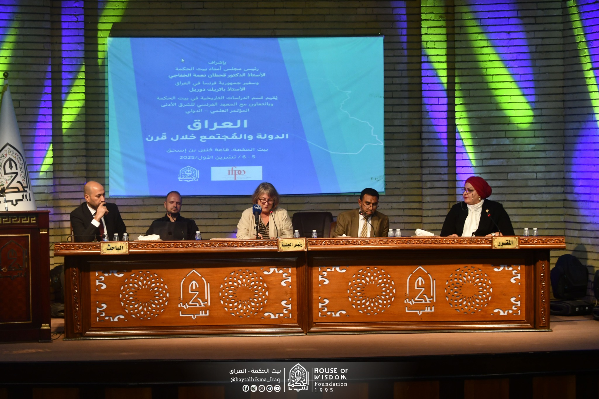 بإشراف مباشر من قبل السيد رئيس مجلس أمناء بيت الحكمة، الدكتور قحطان نعمة حسن الخفاجي، وبحضور أكاديمي عالٍ، وتمثيل دبلوماسي واسع، انطلقت اليوم الأحد 5 تشرين الأول 2025 أعمال المؤتمر العلمي الدولي الموسوم "العراق: الدولة والمجتمع خلال قرن"، والذي أقامه قسم الدراسات التاريخية في بيت الحكمة بالتعاون مع المعهد الفرنسي للشرق الأدنى، في قاعة (حُنين بن إسحاق).