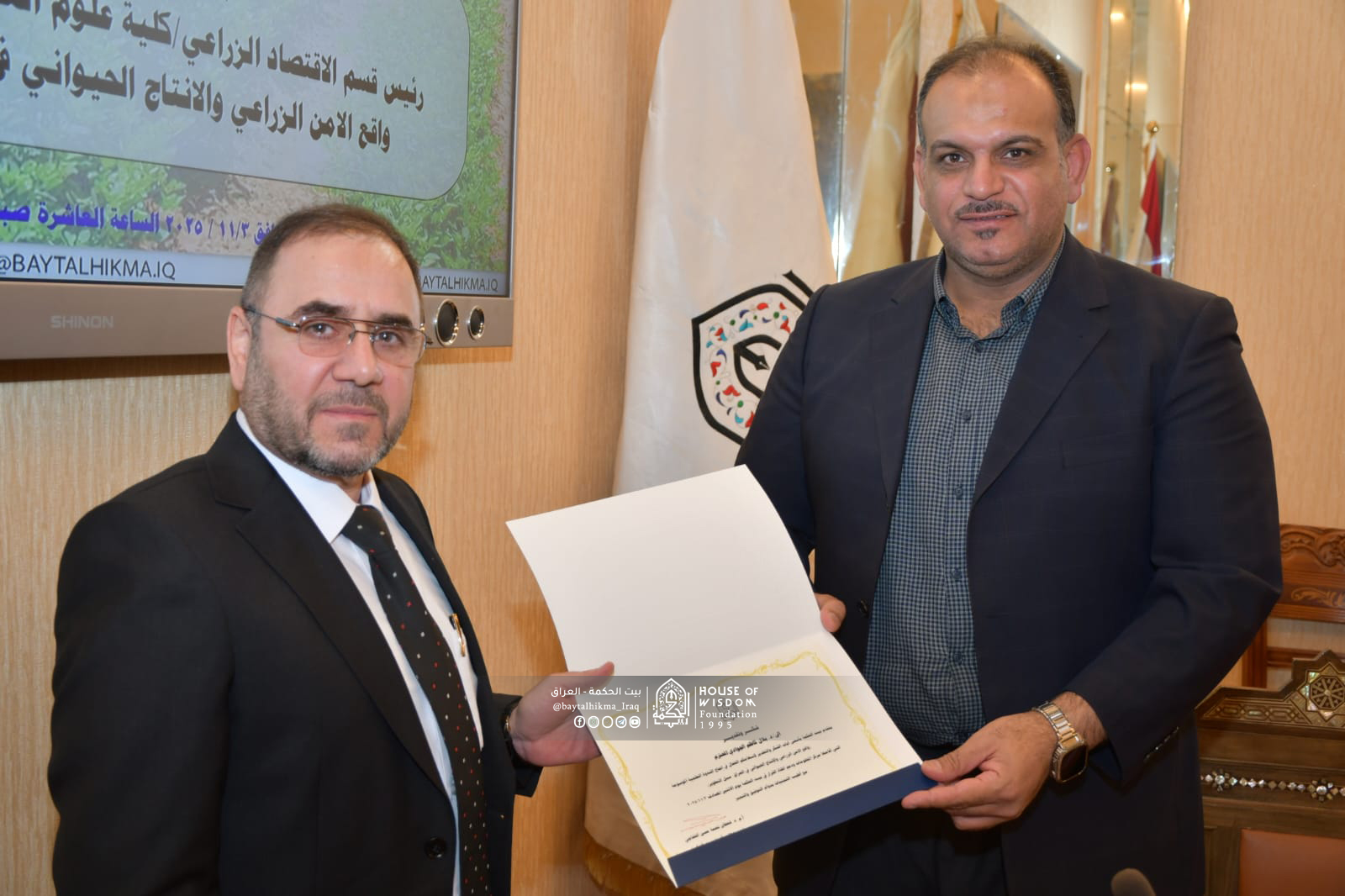 نظم بيت الحكمة - مركز المعلومات ودعم اتخاذ القرار محاضرة علمية حملت عنوان: (واقع الأمن الزراعي والإنتاج الحيواني في العراق: سُبل التطوير)، وذلك يوم الاثنين 3 تشرين الثاني 2025 في قاعة المرايا في بيت الحكمة.