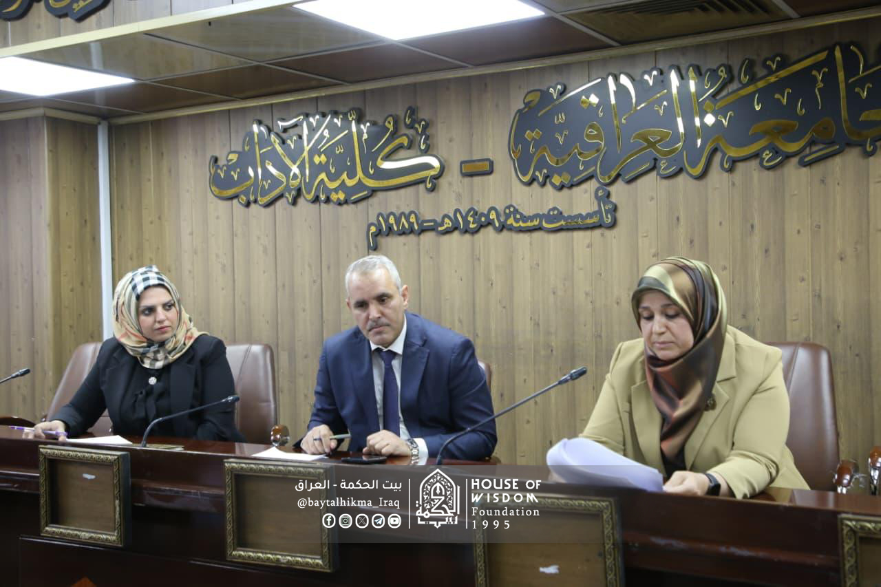نظم بيت الحكمة- قسم الدراسات الإسلامية، بالتعاون مع قسم علوم القرآن في كلية الآداب الجامعة العراقية، ندوته العلمية التي حملت عنوان "دور المؤسسات الدينية والعلمية والتربوية في حفظ الوحدة الوطنية وتنمية القيم الأخلاقية) على قاعة الدراسات العليا في كلية الآداب في الجامعة العراقية. وبحضور كل من عضو مجلس امناء بيت الحكمة الدكتور رائد عكلة الزيدي ، والمعاون العلمي لكلية الآداب الدكتور مثنى ذيب، والمعاون الاداري الدكتور مثنى نعيم، معاون العميد لشؤون الطلبة الدكتور ابراهيم طلعت ، ورئيسة قسم الدراسات الاسلامية في بيت الحكمة الدكتورة مياس ضياء باقر.