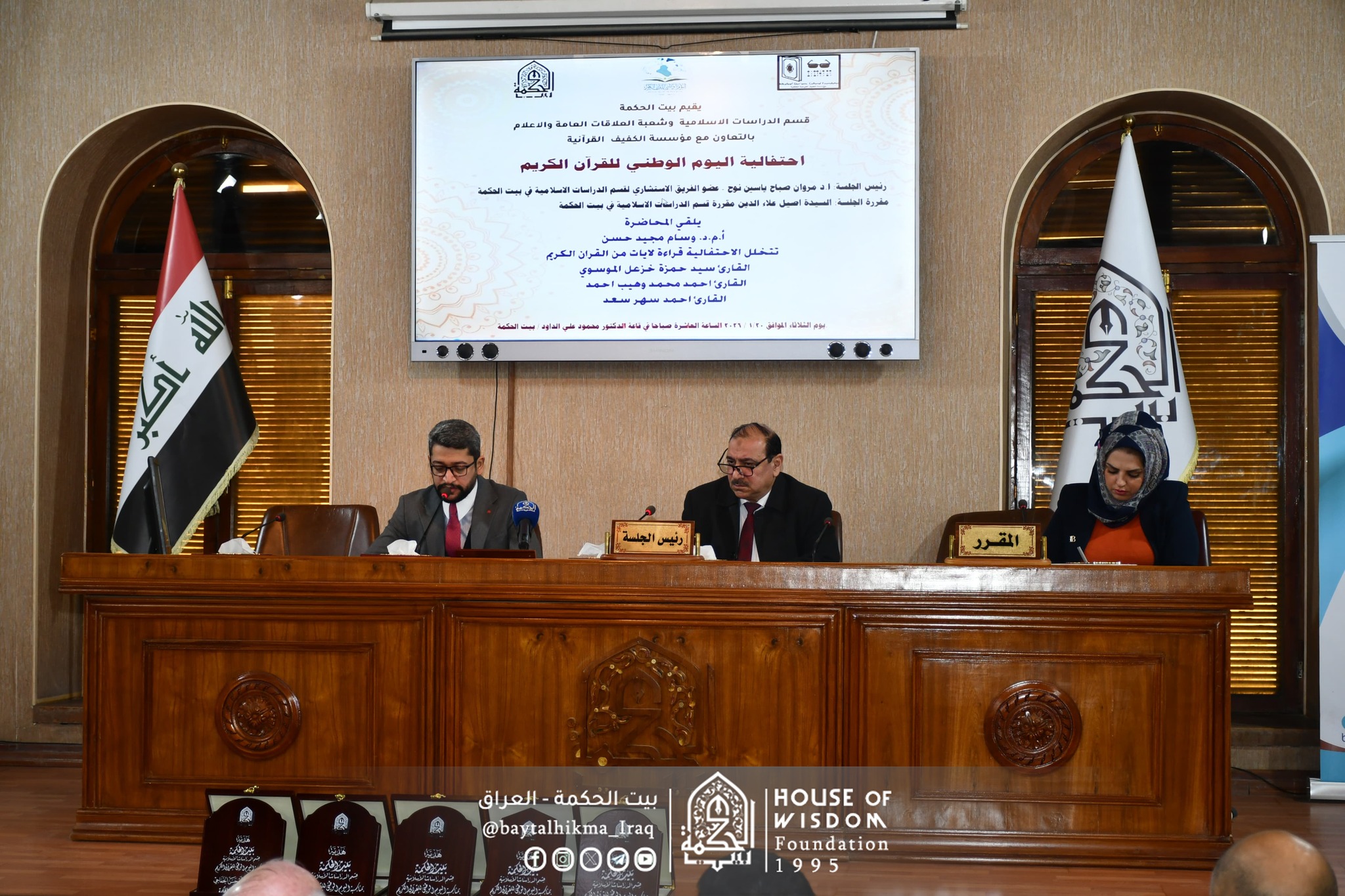 برعاية السيد رئيس مجلس أمناء بيت الحكمة، الأستاذ الدكتور قحطان نعمة حسن الخفاجي، نظّم بيت الحكمة - قسم الدراسات الإسلامية وشعبة العلاقات العامة، بالتعاون مع مؤسسة الكفيف القرآنية الثقافية، اليوم الثلاثاء الموافق 20 كانون الثاني 2026، احتفاليةً بمناسبة اليوم الوطني للقرآن الكريم؛ وهي المناسبة التي أقرها مجلس الوزراء في العام الماضي، بعدٌ يوم السابع والعشرين من رجب من كل عام يوماً وطنياً للقرآن الكريم.