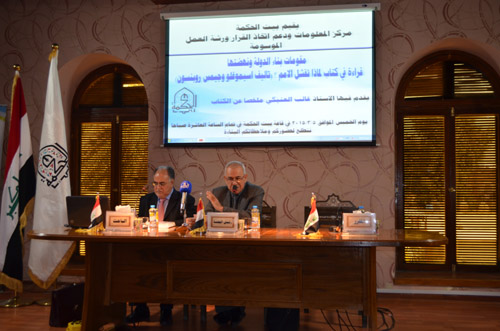 وبحضور الدكتور مظهر محمد صالح المستشار الاقتصادي لدولة رئيس الوزراء والدكتور بهجت حمد شهاب الجبوري نائب رئيس الهيأة العليا لمحو الامية ورئيس الجهاز التنفيذي في وزارة التربية والدكتور مجيد العلاق المدير العام للشؤون الادارية والمالية والقانونية في الجهاز التنفيذي في وزارة التربية والدكتور دهام محمد دهام العزاوي عضو المفوضية العليا لحقوق الانسان والدكتور احسان الامين رئيس مجلس امناء بيت الحكمة وعدد من الأساتذة والباحثين والأكاديميين والمثقفين والإعلاميين وطلبة الدراسات العليا صبيحة يوم الخميس الموافق 5/3/2015 الساعة العاشرة صباحاً في بيت الحكمة.
