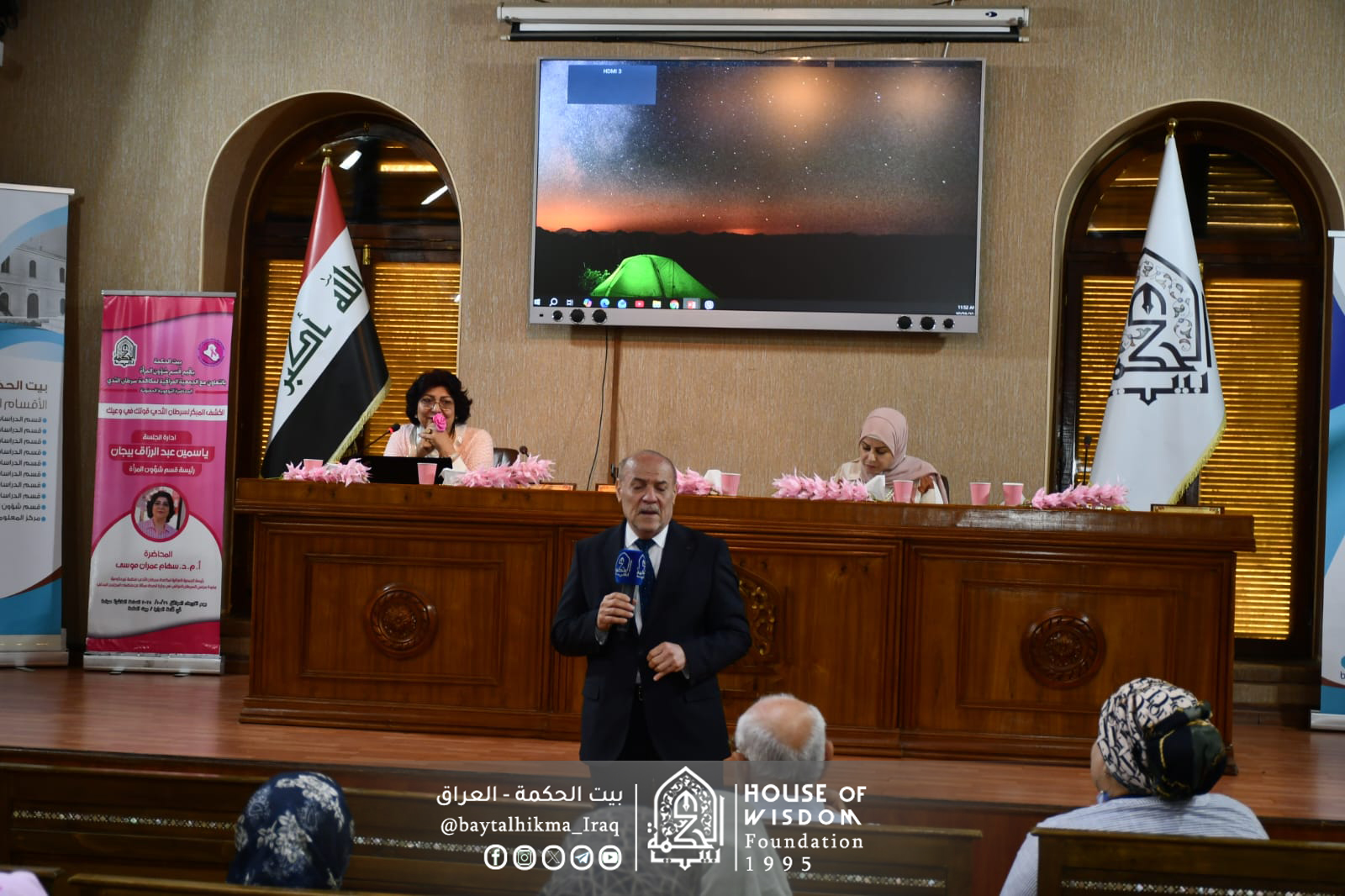 إدارة الجلسة الآنسة ياسمين عبد الرزاق بيجان - رئيسة قسم شؤون المرأة - بيت الحكمة، وحاضرت فيها الدكتورة سهام عمران موسى - رئيسة الجمعية العراقية لمكافحة سرطان الثدي ،وعضوة مجلس السرطان العراقي في وزارة الصحة.