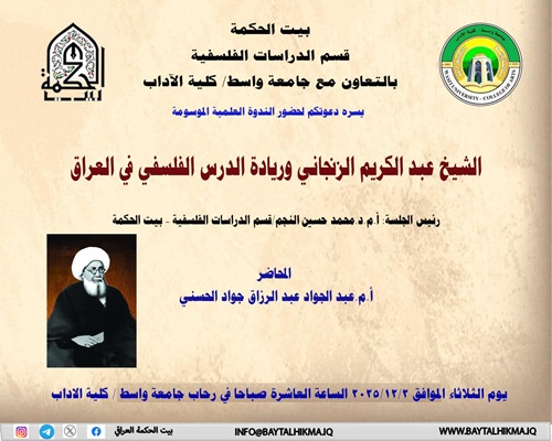 الشيخ عبد الكريم الزنجاني وريادة الدرس الفلسفي في العراق ندوة علمية يقيمها قسم الدراسات الفلسفية |