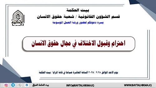 Education, Work, and Building Active Citizenship: Present Challenges and Future ProspectsEthics and its philosophy in the Arab and Islamic worldsIraq. State and Society over a CenturyRespect and acceptance of differences in the field of human rightsRegular meeting of the Board of Trustees of the House of WisdomThe President of the House of Wisdom continues his support for the institution's administrative and academic staff.Preparations for the inclusion of the House of Wisdom on the World Heritage ListAwareness lecture by the Civil Defense Directorate at the House of WisdomThe Third Arab Tourism Statistics ForumUnder the patronage of the Prime Minister, the President of the House of Wisdom attends the launch ceremony of Iraq Vision 2050.The Second International Conference on Cybersecurity and Artificial Intelligence StrategiesHouse of Wisdom Pavilion at the Baghdad International Book FairArabic letter anthologyWar and Peace Between the Philosophical Mind and the Ideological DimensionGlobal Compact for Migration Conference in IraqBayt Al-Hikma honors retired employeesPioneers in History Examples of the Iraqi Historical School's Creativity During the Twentieth CenturyThe First Conference of Editorial Boards of Scientific JournalsEnergy self-sufficiency: a cornerstone on the path to developmentCelebration of the anniversary of the birth of the ProphetSustaining peace and harmony among religious communitiesSupporting Leadership for Energy and Environmental SustainabilityMandaic Language: From Historical Roots to Educational CurriculaCombating corruption: opportunities and challengesCreativity platform activitiesOpening ceremony of the Arab-Kurdish Cultural CenterExercise your right...elect the best...and strengthen democracy in IraqTax Conference for Economic Development and Investment Environment StimulationFor the memorial symposium of the scholar Sheikh Dr. Ahmed Al-Waili (may God have mercy on him)The repercussions of ending the oil transport agreement through the port of Ceyhan on IraqDrugs and Their Impact on Human RightsArabic Language Award CeremonyCentral Banks Theories and Monetary PoliciesComprehensive digital transformation of electronic paymentsThe Husseini Renaissance in the Literature and Thought of Sheikh Al-WailiPeriodic meeting to launch the first report on curbing illegal immigrationA delegation from the Ministry of InteriorAwareness lecture by the Civil Defense DirectorateHuman dialogue between the classes of Iraqi societyThe role of religious discourse in the Husseini renaissanceYabit Al-Hikma remembers victims of terrorism on National Genocide DayThe Chairman of the Board of Trustees meets with the Academic Promotion CommitteeThe role of administrative judiciary in protecting public rights and freedomsNational Center for Joint PlanningDelegation of the Higher Committee for Monitoring the Implementation of Tax ReformBuilding the media image of the leadership personality, and skills of dealing, appearing, and influencing the mediaBaytul-Hikma Enhances Prospects for Scientific Cooperation with the Endowment Office for Christian, Yazidi, and Mandaean ReligionsPolitical participation of Iraqi women "The Eloquence of Conciseness: The Philosophy of Economy in Language and Meaning"Political participation of Iraqi women