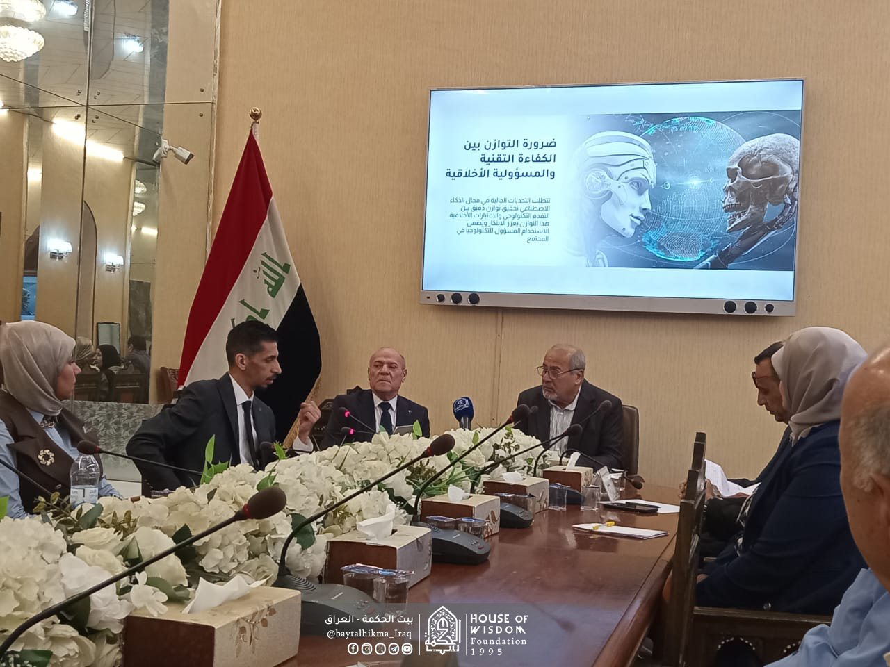 ختاماً قدّم الباحث حسام خليل خضير - مدير شعبة الذكاء الاصطناعي والأمن السيبراني - بيت الحكمة ،بحثاً حمل عنوان (الذكاء الاصطناعي بين الكفاءة التقنية والمسؤولية الأخلاقية - مقاربة فلسفية هندسية) ،تناول فيه الإشكالية المعاصرة التي تتمثل في العلاقة المعقدة بين الجهود المتسارعة لتحقيق تقنيات متقدمة في الذكاء الاصطناعي، والالتزام بالمعايير الأخلاقية المسؤولة. ويتم ذلك من خلال مقاربة فلسفية وهندسية تهدف إلى دمج المنطق التقني الدقيق مع التفكير النقدي الفلسفي. الهدف هو استكشاف كيفية تصميم أنظمة ذكية تكون فعّالة، وفي الوقت نفسه عادلة وشفافة ومتوافقة مع القيم الإنسانية.