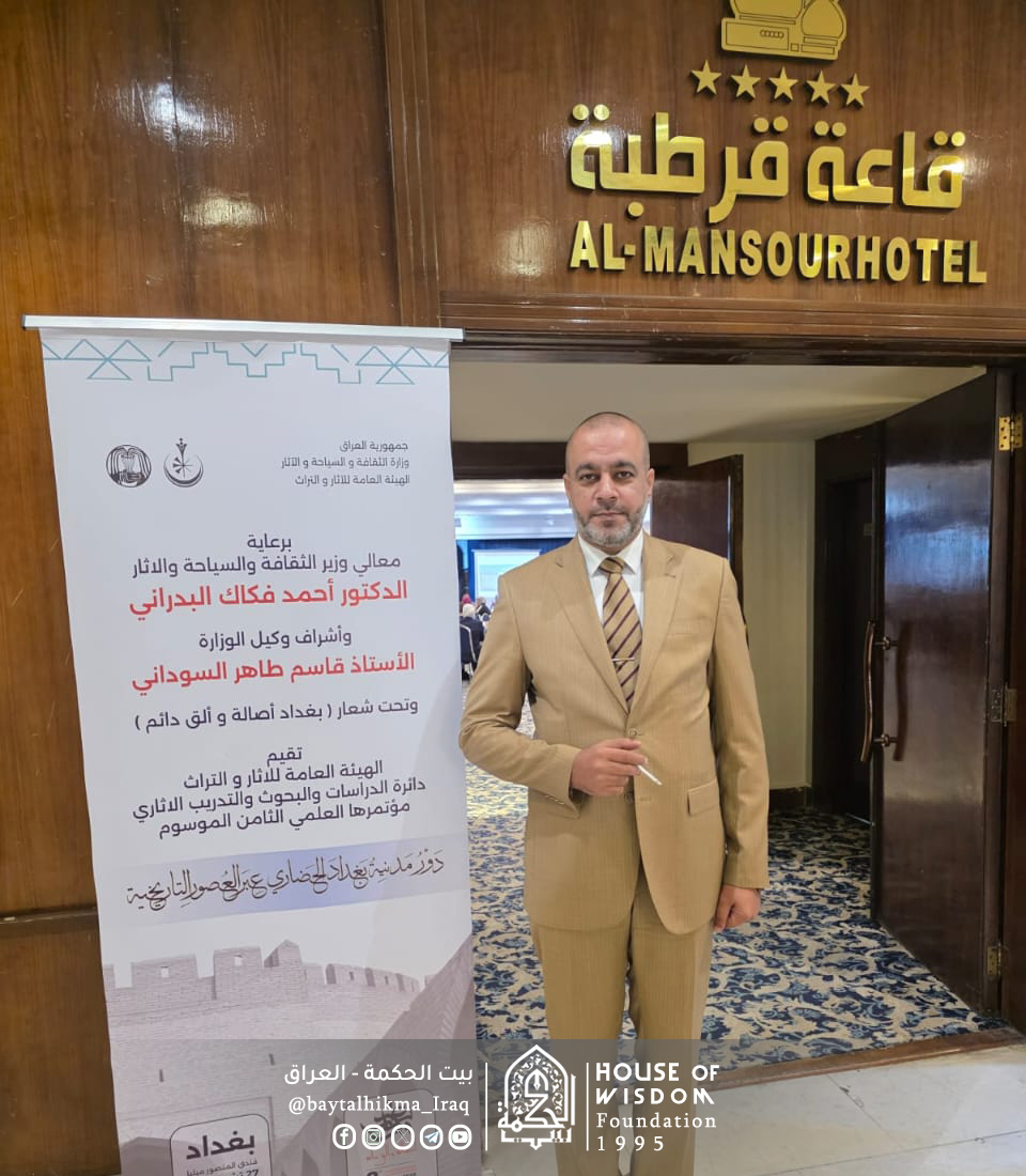 شارك السيد أمين عام بيت الحكمة، ورئيس قسم الدراسات التاريخية، الأستاذ الدكتور حيدر قاسم مَطَر التميمي، في المؤتمر العلمي الثامن لدائرة الدراسات والبحوث والتدريب الآثاري في الهيئة العامة للآثار والتراث، الموسوم "دور مدينة بغداد الحضاري عبر العصور التاريخية" الذي انعقد يوم الاثنين، 27 تشرين الأول 2025، على قاعة قرطبة بفندق المنصور ميليا، تحت شعار: "بغداد أصالة وألق دائم"، وسط حضورٍ واسع من الباحثين والأكاديميين والمُختصين في مجالات التاريخ والآثار والتراث، وتمثيل سياسي رفيع المستوى.
