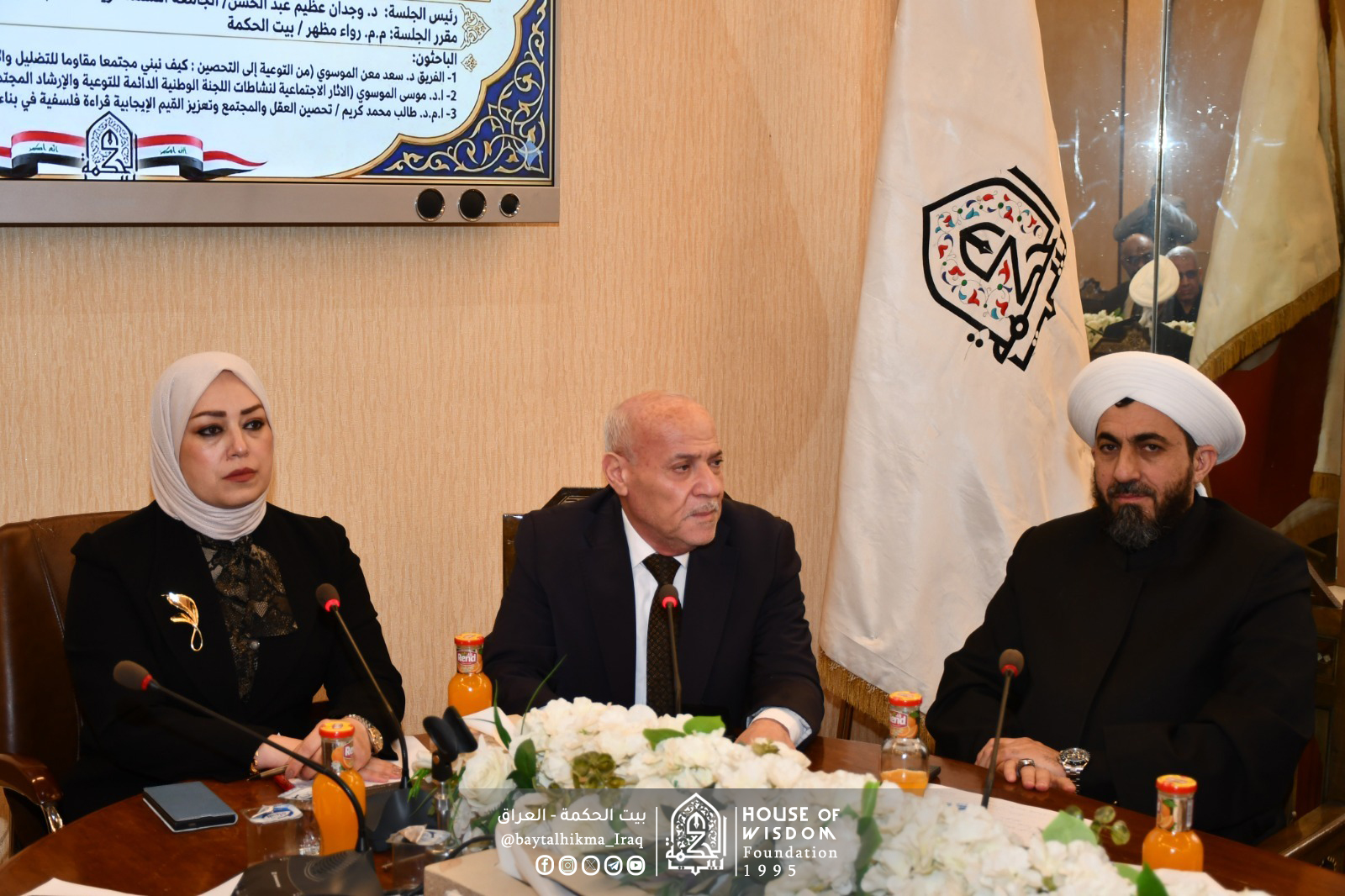 من جانبه، أكد السيد رئيس مجلس الأمناء الدكتور قحطان نعمة حسن الخفاجي، أن تحصين المجتمع يبدأ من بناء عقل واعٍ قادر على التمييز بين المعلومات الصحيحة والمضللة، مؤكداً دور بيت الحكمة في تعزيز القيم الإيجابية ونشر ثقافة الاعتدال والحوار واحترام الرأي الآخر.